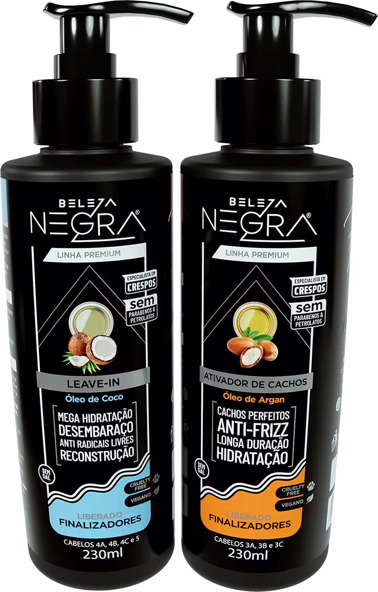 Beleza Negra Premium Óleo de Coco - Leave-in 230ml: promove a selagem das cutículas para um cabelo mais saudável e hidratado, pois possui ativos especiais que auxiliam no fortalecimento e restauração dos fios, além de promover brilho intenso e a diminuição do frizz. Produto ideal para cabelos crespos.