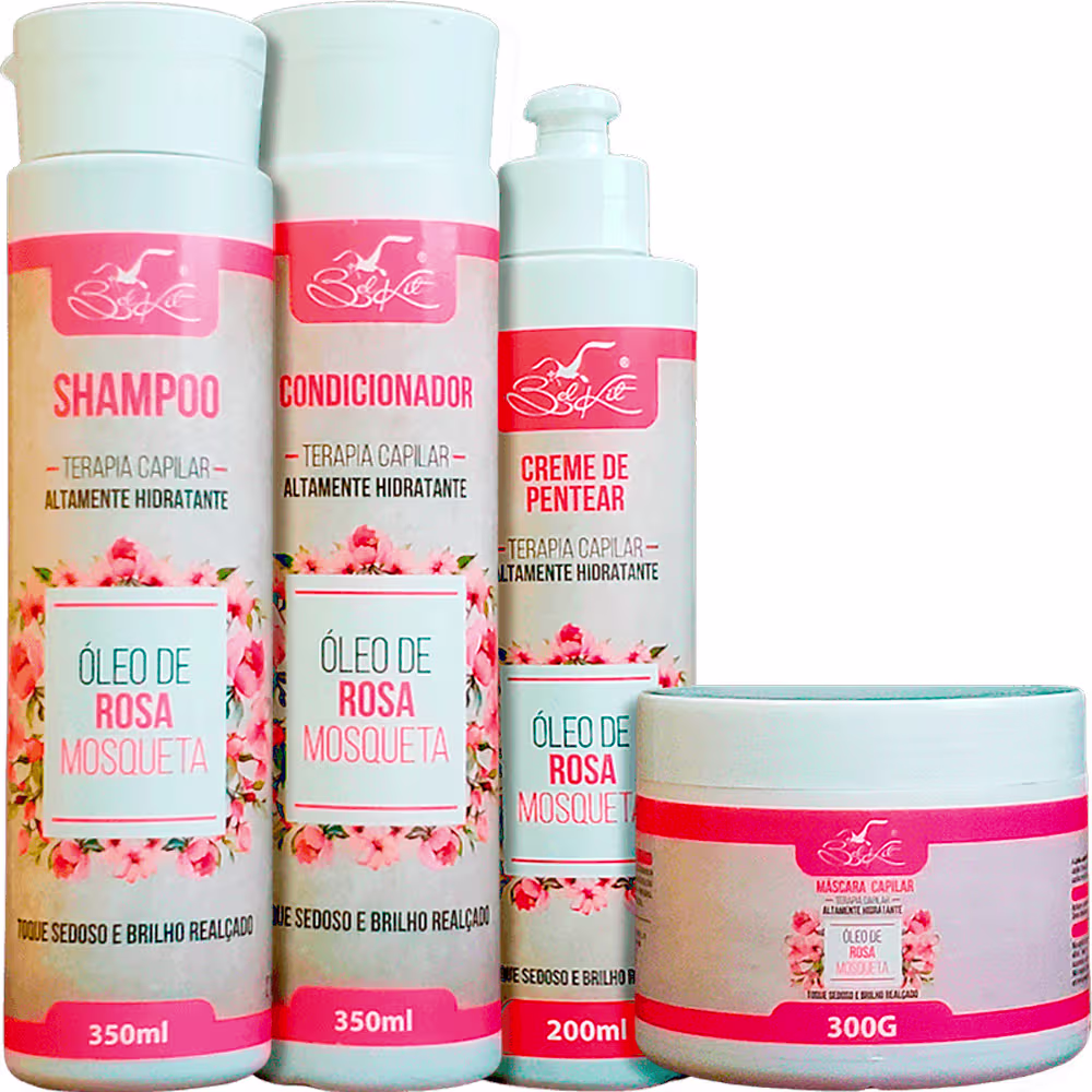 Não sei o CEPKit com shampoo, condicionador, máscara e leave-in para cabelos secos ou ressecados. Belkit Óleo de Rosa Mosqueta Terapia Capilar Hidratante revitaliza, hidrata e sela os fios.