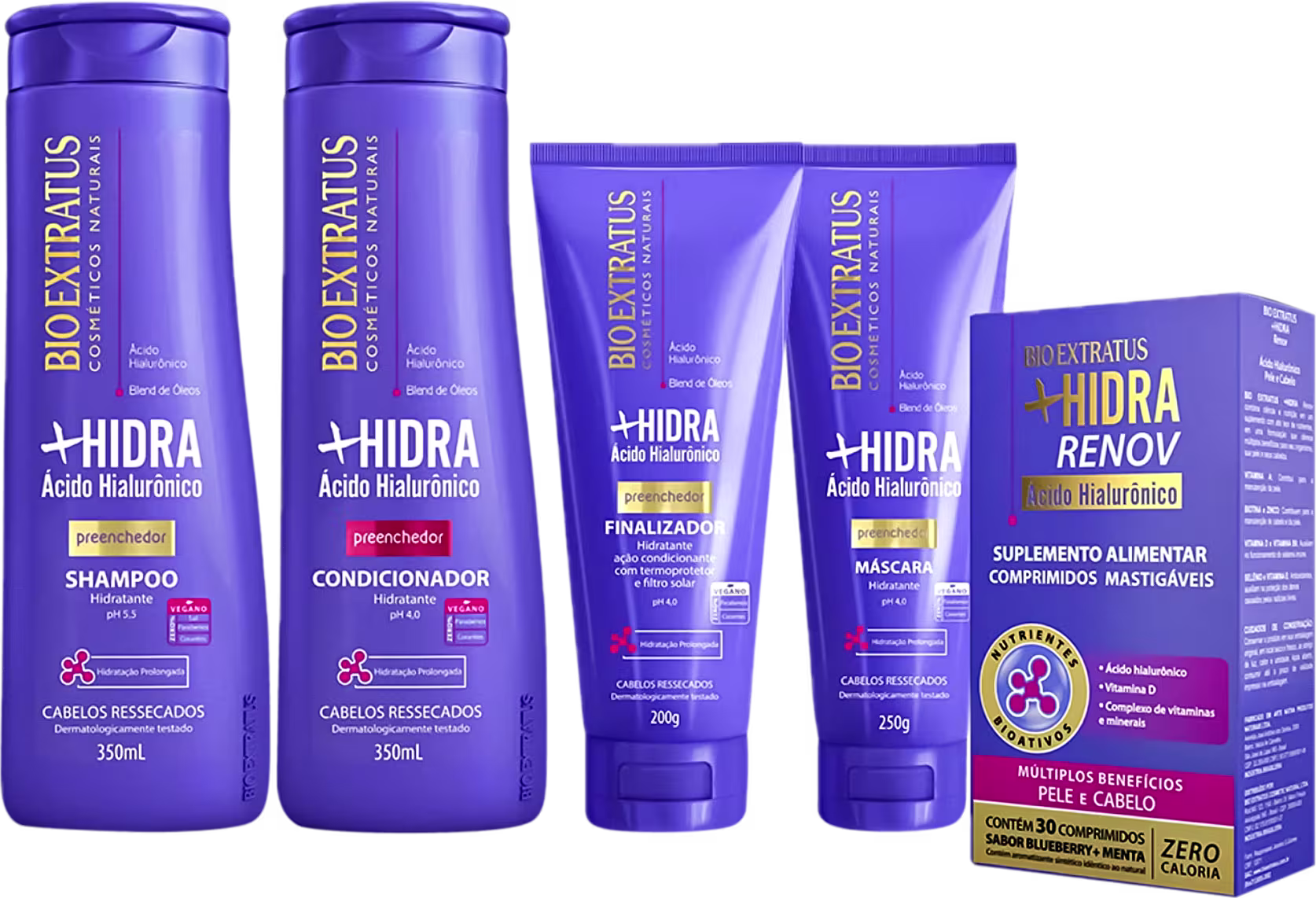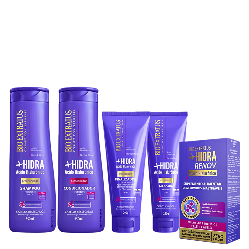 Kit de revitalização dos fios. Bio Extratus + Hidra Completo é ideal para promover nutrição e restauração capilar, com proteção e brilho. Uma linha completa contando com o poder do Ácido Hialurônico como seu principal componente.