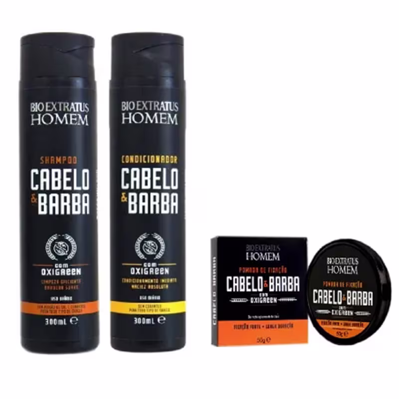 Não sei o CEPKit com shampoo e condicionador para cabelo e barba e pomada de fixação. Bio Extratus Homem Cabelo & Barba é ideal para cuidar e estilizar os fios.