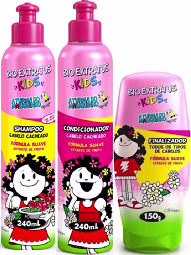 Não sei o CEPKit infantil com shampoo, condicionador e finalizador para cabelos cacheados. Bio Extratus Kids Cabelo Cacheado é ideal para cuidar dos cachinhos com carinho.
