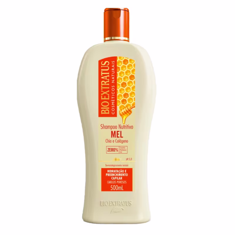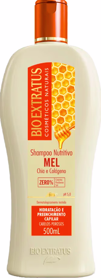 Bio Extratus Mel - Shampoo 500ml: promove limpeza hidratante e nutritiva, e inicia o tratamento de preenchimento dos fios porosos.