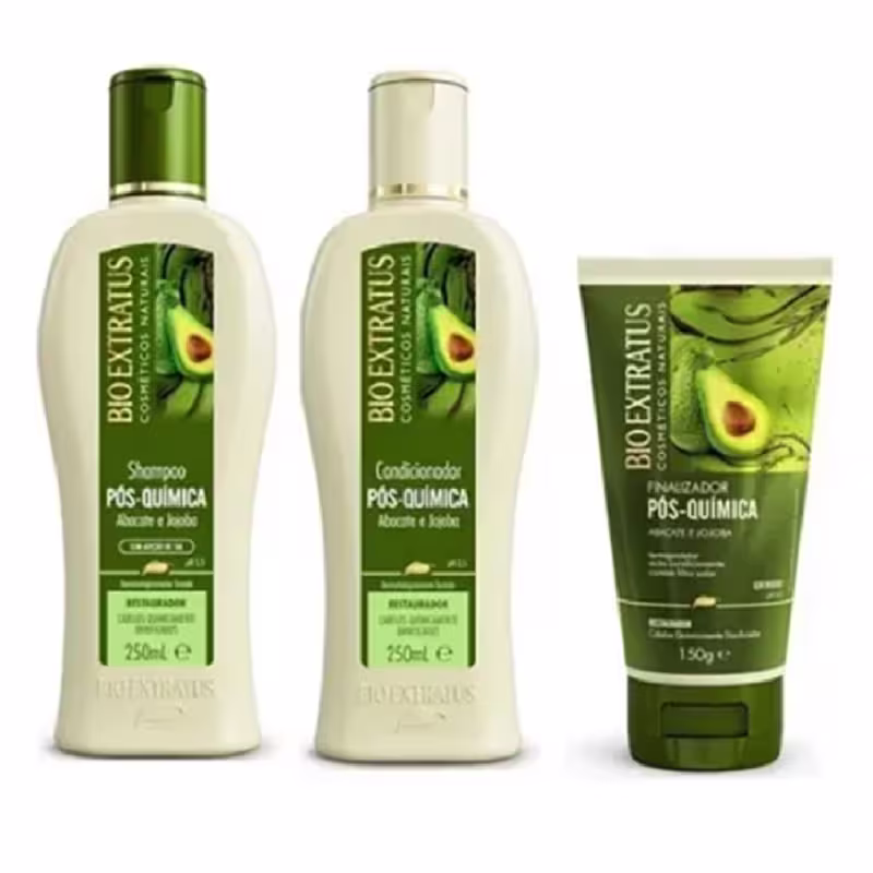 Kit com shampoo, condicionador e finalizador para cabelos quimicamente tratados. Bio Extratus Pós-Química é ideal para restaurar e proteger os cabelos danificados por química.