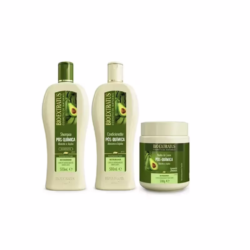 O Kit Bio Extratus Pós-Química Plus Trio combina a potência hidratante do abacate e da jojoba para criar uma linha que restaura e protege seus fios dos danos que causam ressecamento, opacidade e porosidade aos fios.