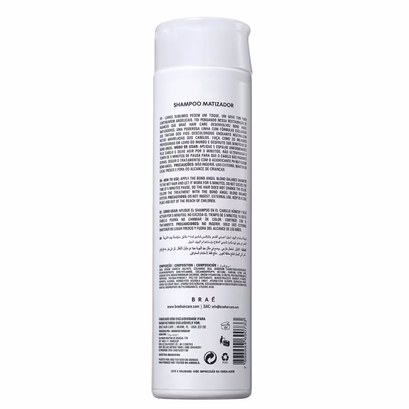 Braé Bond Angel - Shampoo Matizador 250ml: limpa suavemente, revitaliza a cor e possui ação remineralizante e nutritiva para resgatar o aspecto saudável dos cabelos, que ganham brilho e vitalidade.