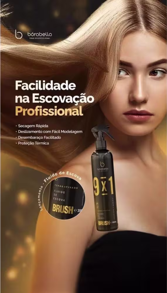 Borabella 9x1 Brush - Leave-In 300ml: promove o deslizamento controlado da escova, desembaraço, proteção térmica, além de reduzir em até 30% o tempo de secagem.
