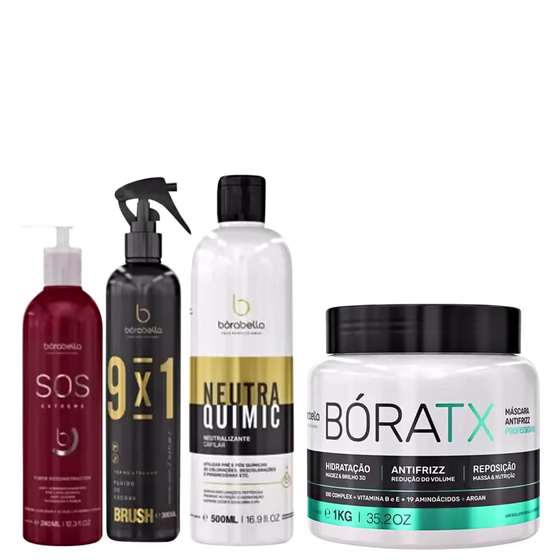 O Kit Borabella BóraTX Neutra SOS Extreme Brush proporciona uma reposição completa de massa capilar, alinhando os fios e diminuindo o volume. Sela as cutículas capilares, deixando os cabelos brilhantes e com o pH neutralizado. Com efeito anti-quebra e anti-emborrachamento, este kit garante fios saudáveis, fortes e revitalizados.