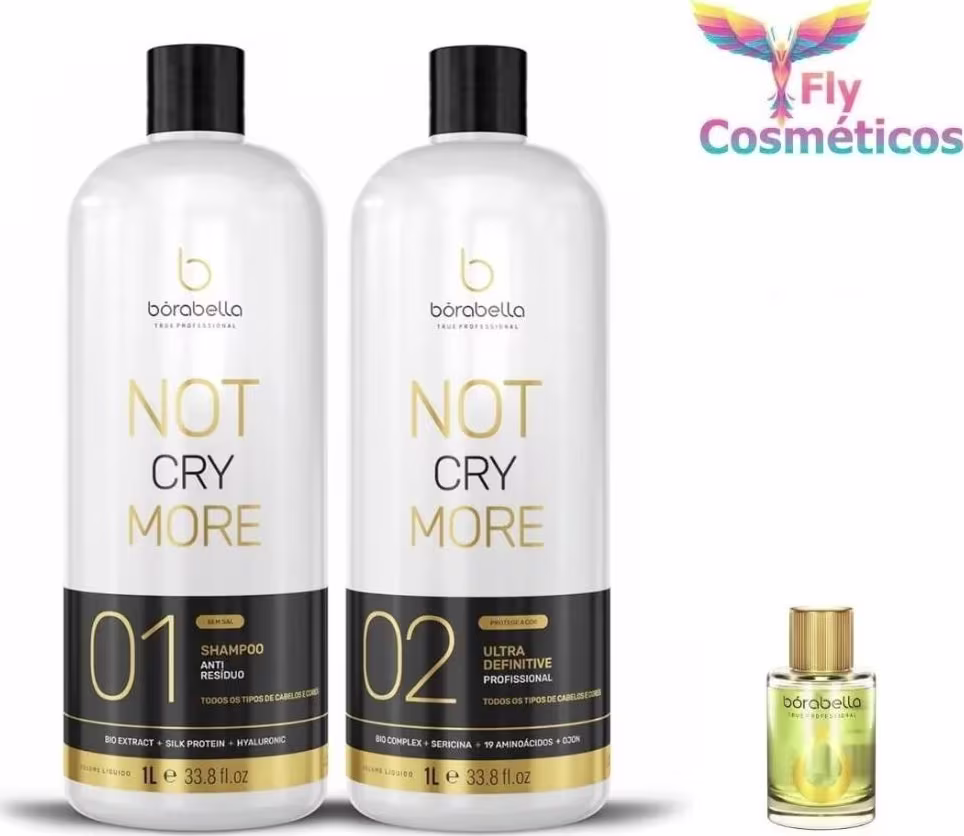 Kit de escova progressiva. Borabella Not Cry More Progressiva Salon promove um alisamento com eficiência e segurança para a saúde, sem causar ardência nos olhos, já que age na estrutura dos fios, amolecendo as cadeias de Enxofre.