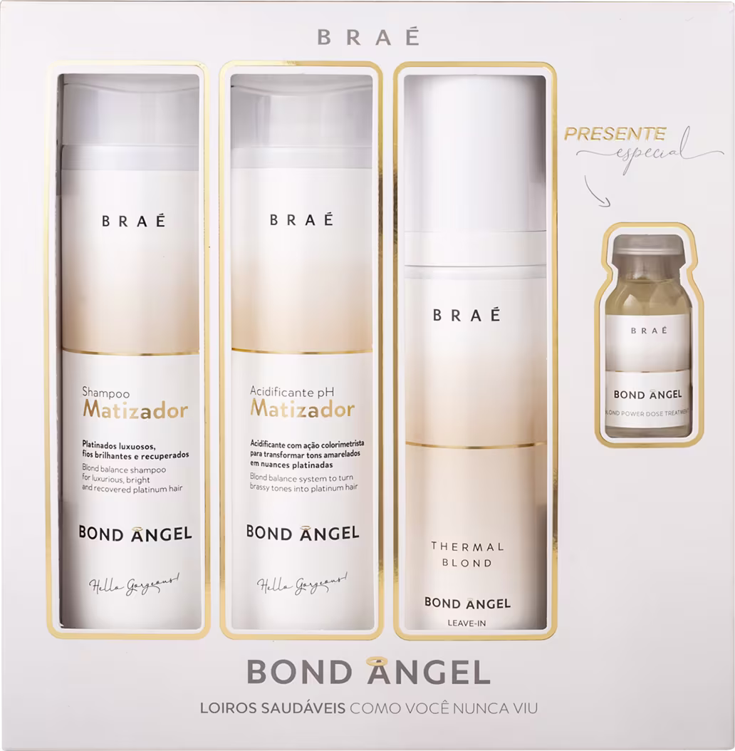 Kit com shampoo, matizador, leave-in e ampola para cabelos loiros. BRAÉ Bond Angel Caixa Presente apresenta um cuidado intenso para um loiro renovado e com a cor perfeita.