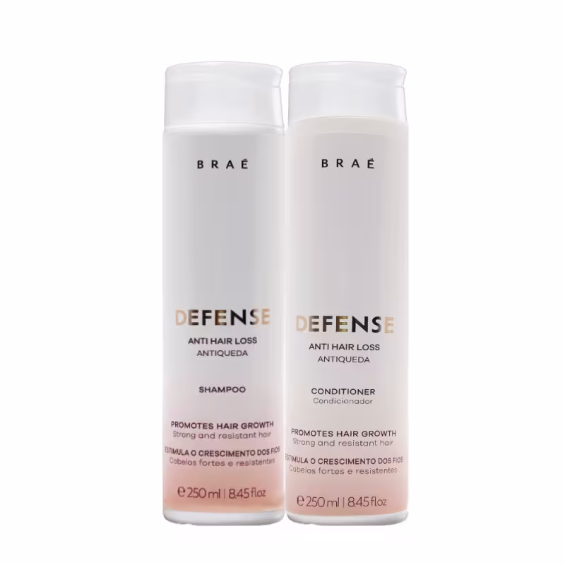 Kit com shampoo e condicionador para cabelos danificados. Braé Defense Antiqueda Dupla desembaraça e fortalece.