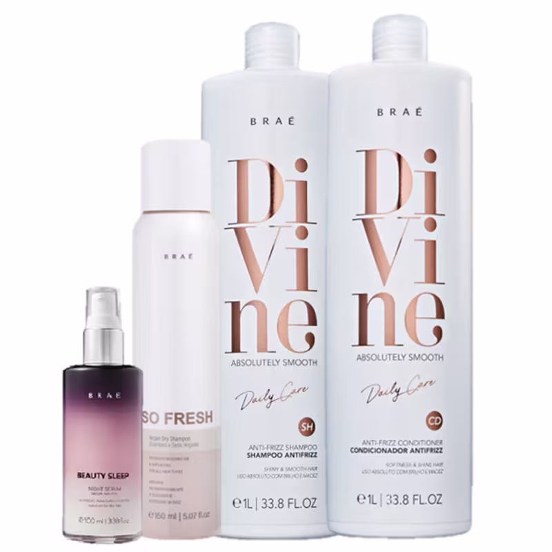 Não sei o CEPKit com shampoo, condicionador, tratamento noturno e shampoo a seco. Braé Divine Antifrizz Beauty Sleep So Fresh hidrata e nutre os fios intensamente.