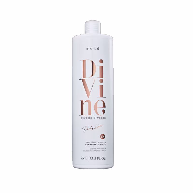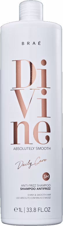 Braé Divine - Shampoo 1L: shampoo para cabelos com frizz. Deixa os fios mais alinhados e disciplinados durante a limpeza. É perfeito para quem já tem química e deseja manter o efeito liso duradouro.