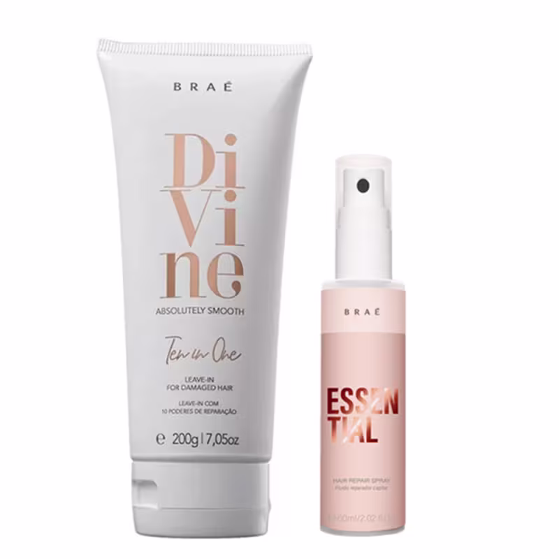 Kit com 2 leave-ins para cabelos danificados. Braé Divine + Essential Mini hidrata, fortalece e dá brilho aos fios, além de oferecer proteção térmica e mais 10 poderes de reparação.