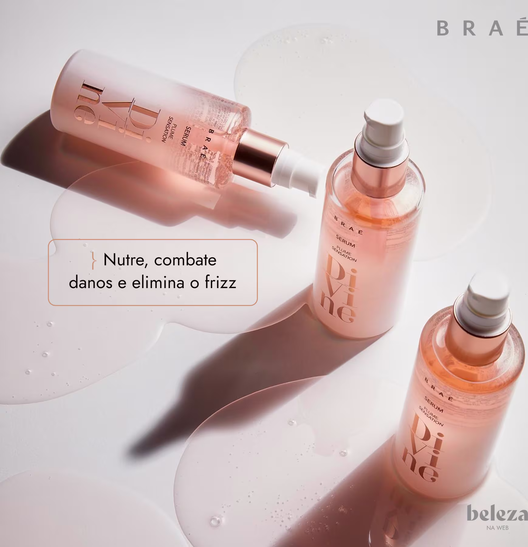 BRAÉ Divine Plume Sensation - Sérum Reparador Capilar 60ml: realiza a nutrição dos fios, combate danos como o frizz e as pontas duplas. Promove alinhamento das cutículas, impede aspecto pesado nos fios, confere elasticidade e garante toque sedoso. O cabelo fica leve e com balanço natural.