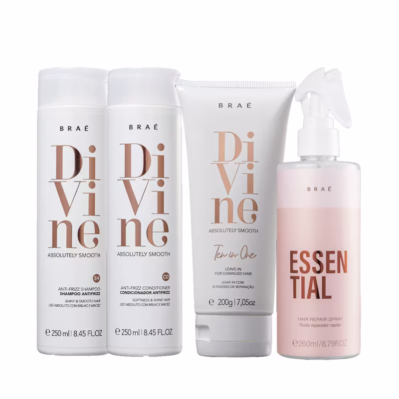 O Kit Braé Divine Essential Ten in One possui em seus produtos ativos com tecnologias que eliminam o volume e proporcionam um cabelo mais controlado. Além disso, conta com ação antifrizz, protege do calor de ferramentas térmicas e confere brilho e maciez aos cabelos. É ideal para quem já tem química e deseja manter o efeito liso duradouro.