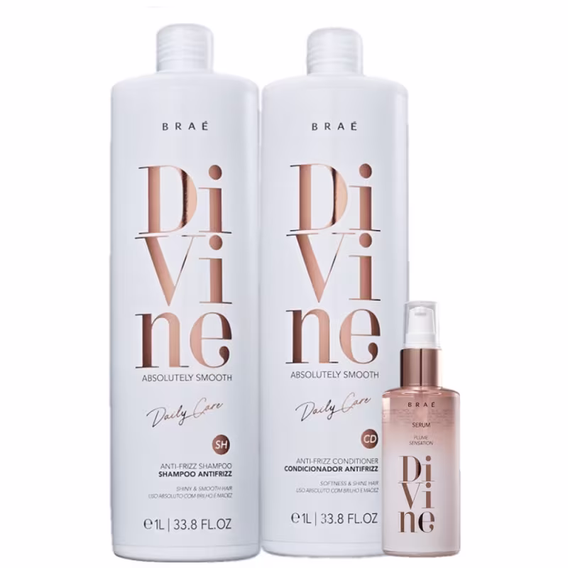 Kit com shampoo, condicionador e sérum capilar. Braé Divine Fios Alinhados controla o frizz, hidrata e nutre os fios.