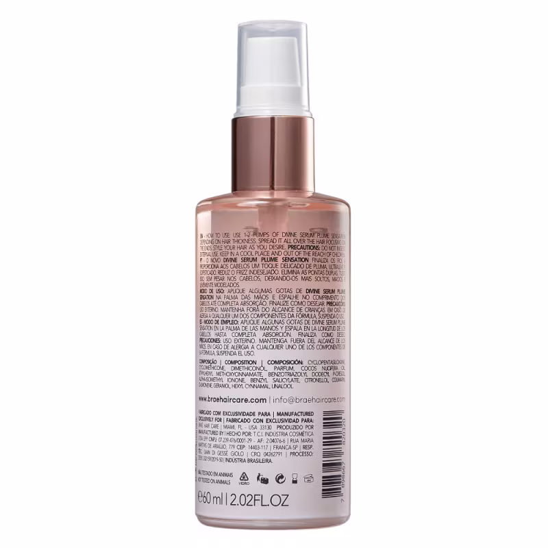 Braé Divine - Sérum Plume Sensation 60ml: promove alinhamento das cutículas, impede aspecto pesado nos fios, confere elasticidade e garante toque sedoso. Seu cabelo fica leve e com balanço natural.