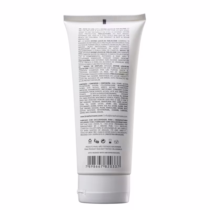 Braé Divine - Leave-in Ten in One 200g: proporciona hidratação, ação antifrizz, força, proteção térmica, maciez, brilho, proteção UV, ação antiquebra e maleabilidade. Além disso, garante uma modelagem leve nos fios. Com ele, seu cabelo fica revitalizado e nutrido.