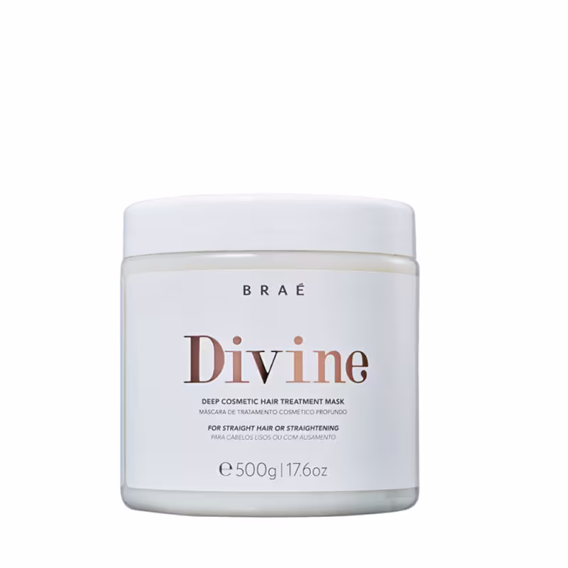 Braé Divine - Máscara Capilar 500g: nutre intensamente, restaura e alinha os fios. Também fortalece, proporciona maciez, recupera o brilho e a maleabilidade. Ideal para prolongar o efeito liso, tratar as camadas mais externas do fio e hidratar completamente.