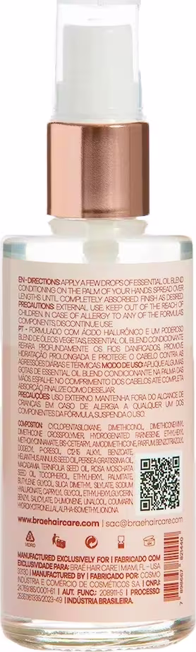 Braé Essential - Oil Blend 60ml: é o segredo para cabelos perfeitamente nutridos e protegidos. Sua fórmula exclusiva combina ácido hialurônico com um poderoso blend de óleos vegetais, proporcionando uma reparação profunda dos fios danificados, hidratação prolongada e proteção contra as agressões térmicas e diárias. Com o Essential Oil Blend, seus cabelos terão uma aparência saudável, brilhante e cheia de vida.