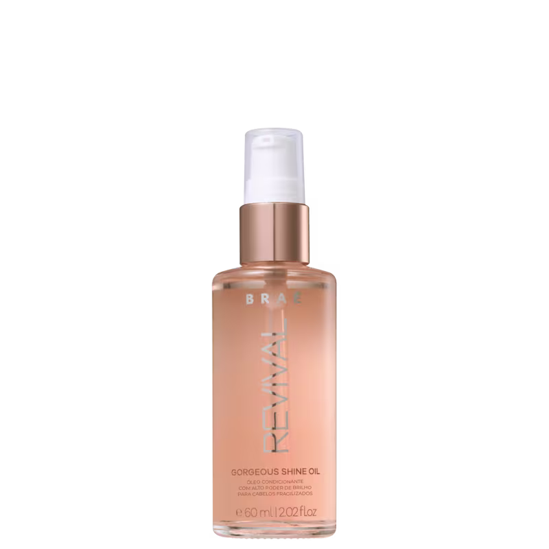 Braé Revival Gorgeus Shine Oil - Óleo Capilar 60ml: apresenta ação repositora lipídica, elaborado com Óleos de Coco, Abacate e Macadâmia. Hidrata, nutre, sela e fortalece as pontas ressecadas, promovendo brilho intenso, maciez e vitalidade aos fios.