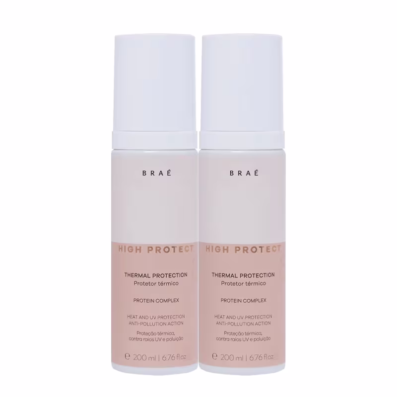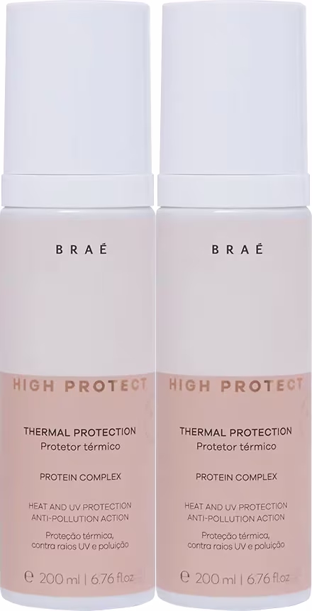 O Kit Braé High Protect Thermal Protection Duo traz produtos que garantem proteção contra choques térmicos (de até 230°) causados pelo uso de fontes de calor, como secadores e modeladores, além de reduzir o tempo de secagem do cabelo e proteger contra ação de raios UV e poluição.