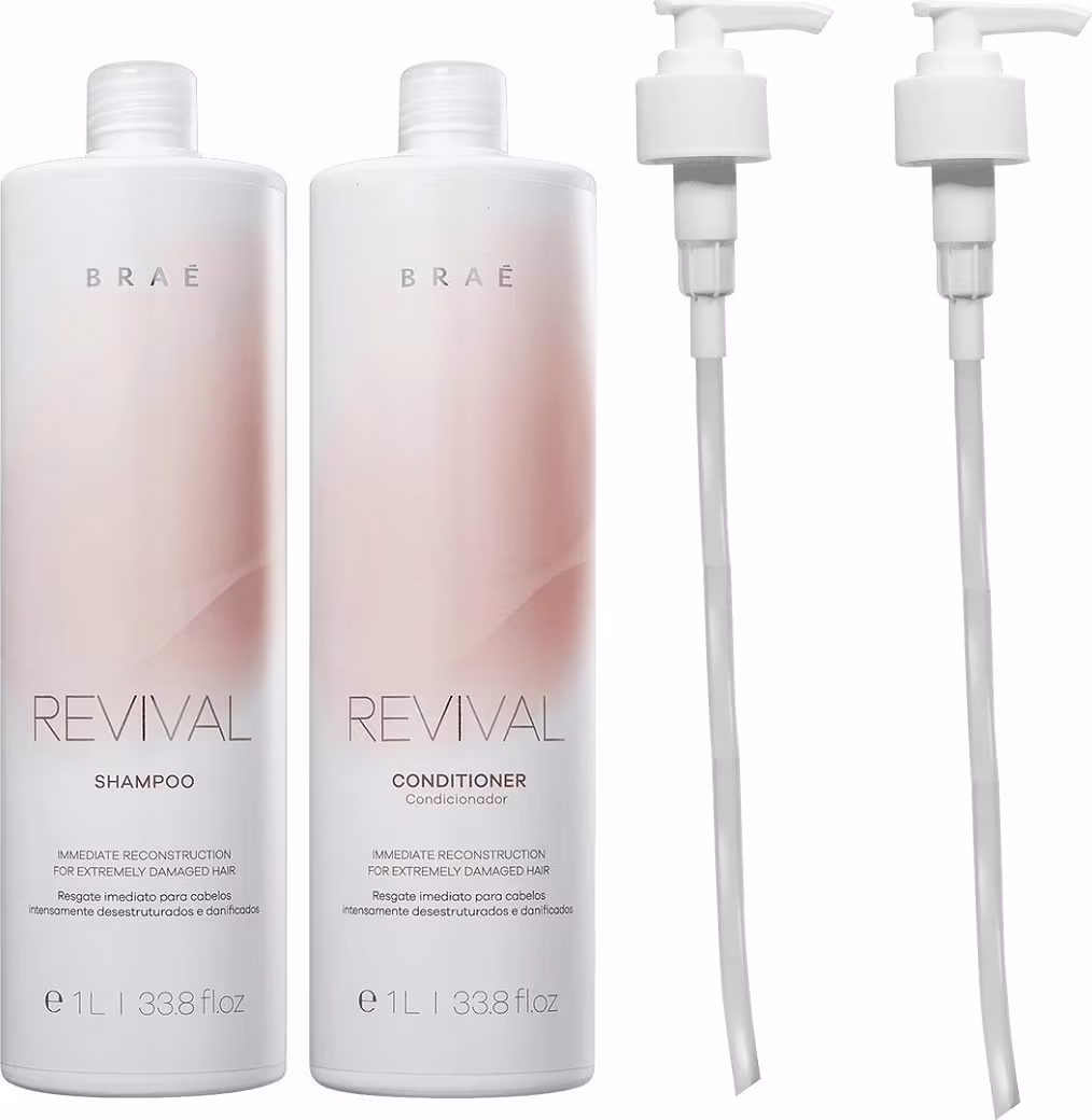 Kit com shampoo e condicionador para cabelos danificados. Kit Braé Revival Duo Salon acompanha duas válvulas dosadoras.
