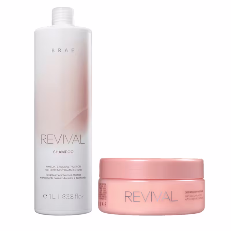 Kit com shampoo e máscara capilar para cabelos danificados e fragilizados. Braé Revival Reconstrução recupera os fios, dá força e resistência.