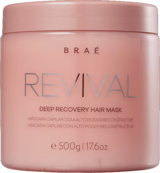 Braé Revival - Máscara de Reconstrução 500g: atua na recuperação e proteção da fibra capilar, deixando-a forte, hidratada e com brilho. Também cria uma película protetora em torno do fio para que o cabelo fique mais brilhante, resistente e cheio de vida.
