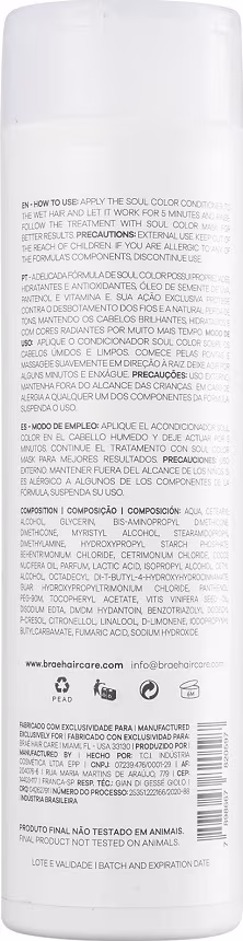 Braé Soul Color - Condicionador 250ml: promove hidratação e auxilia a desembaraçar os fios enquanto protege, renova e evita o desbotamento da cor. Deixa os cabelos extremamente leves e com muito movimento. Sua fórmula traz exclusiva tecnologia, combinando vitamina E, Óleos de semente de Uva, Coco e Pantenol.