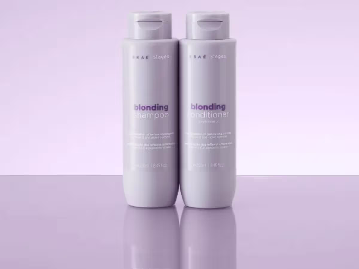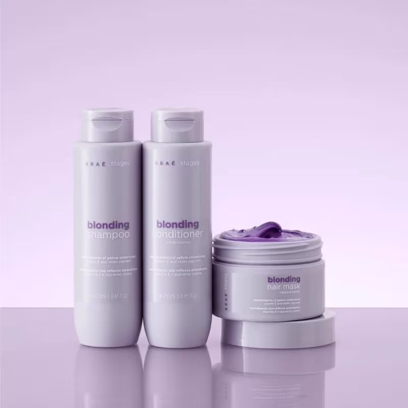 Kit para cabelos loiros com shampoo e condicionador. Braé Stages Blonding Duo Day neutraliza tons amarelados e nutre profundamente os fios.