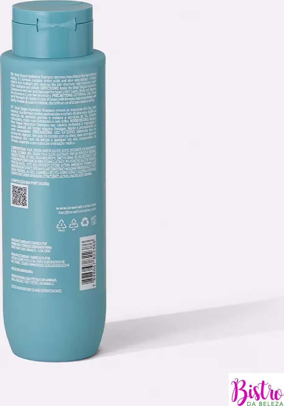 Braé Stages Hydration - Shampoo 250ml: limpa delicadamente e restaura a umidade perdida dos fios. Formulado com aminoácidos e extrato de aloe vera, proporciona hidratação intensa, resultando em cabelos revitalizados, macios e brilhantes.