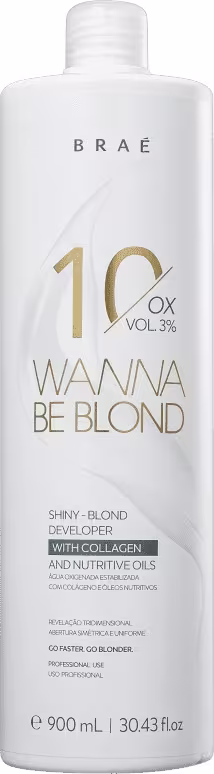 Braé Wanna Be Blond - Águas Oxigenadas de 10, 20, 30 Volumes 900ml: clareia até 4 tons para revelar loiros platinados ou clarear fios escuros naturalmente. Ilumina tons de maneira uniforme e age harmoniosamente com o descolorante Wanna Be Blond. BRAÉ Wanna Be Sua fórmula conta com colágeno que preserva a fibra capilar durante a descoloração, para que não fique muito danificada. Também conta com blend de óleos que deixa os fios macios, com brilho e maleabilidade.