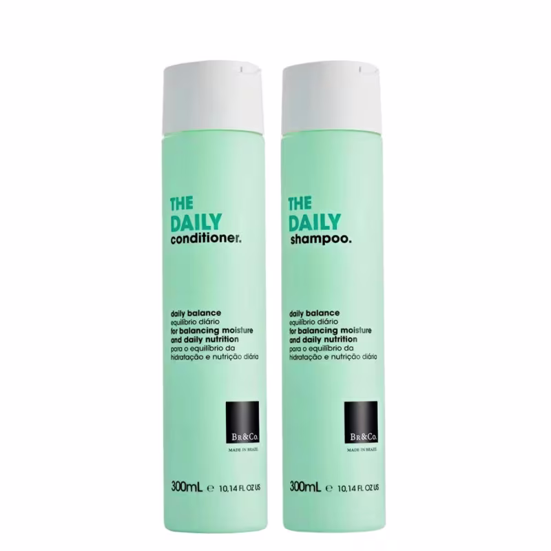 Kit com shampoo e condicionador para todos os tipos de cabelo. Br&Co The Daily Dupla de Equilíbrio trata os fios com ação hidratante e nutritiva.