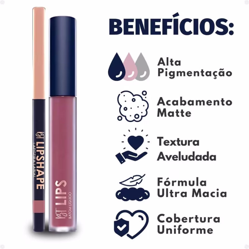 O Kit Bruna Tavares BT Flavia & Beige Rose é o combo ideal para lábios impactantes, definidos e de longa duração. A combinação do icônico Batom Líquido Matte BT com a Lapiseira Labial BT Lipshape oferece cor intensa, acabamento profissional e alta performance, garantindo contorno preciso e preenchimento perfeito para um visual marcante e sofisticado.