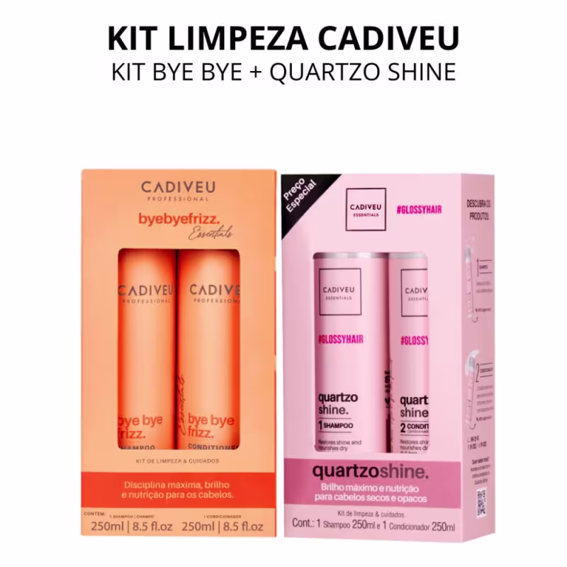 Kit para cabelos secos, opacos e com frizz. Cadiveu Essentials Bye Bye Frizz + Quartzo Shine limpa, disciplina e condiciona, sem pesar ou ressecar.