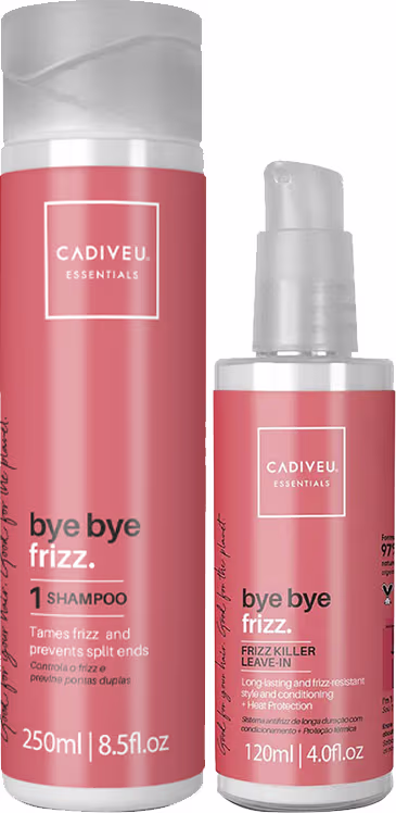 Kit com shampoo e leave-in para todos os tipos de cabelo. Cadiveu Professional Essentials Bye Bye Frizz aumenta o brilho e controla o frizz por até 72 horas.