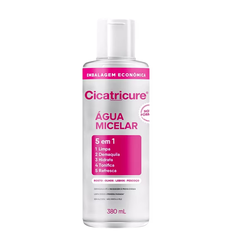 Cicatricure Água Micelar - Demaquilante 380ml: enriquecida com Água de Rosas. Contém micelas que, com uma única passada, atuam como ímãs para capturar a sujeira, a maquiagem e a oleosidade da pele. Limpa desde a primeira passada, demaquila até a maquiagem à prova d'água e hidrata, tonifica, refresca. Além disso, é livre de álcool e não irrita a pele.