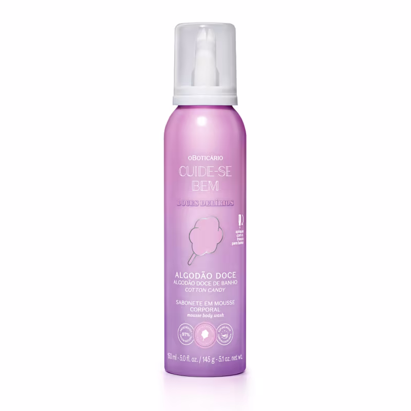 Sabonete em Mousse Corporal Doces Delírios (Cuide-se Bem): Limpeza suave com textura ultra cremosa e fragrância de algodão doce.