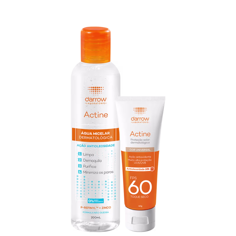 Kit com água micelar e protetor solar com cor para peles acneicas, mistas e oleosas. Darrow Actine Dermatológica FPS60 limpa profundamente enquanto protege e equilibra a aparência do rosto.