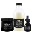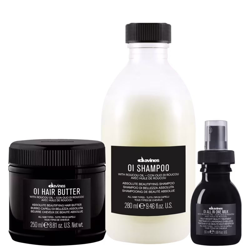 Kit com shampoo, manteiga capilar e spray para todos os tipos de cabelos. Davines Oi Trio Home Care ilumina e amacia os fios.