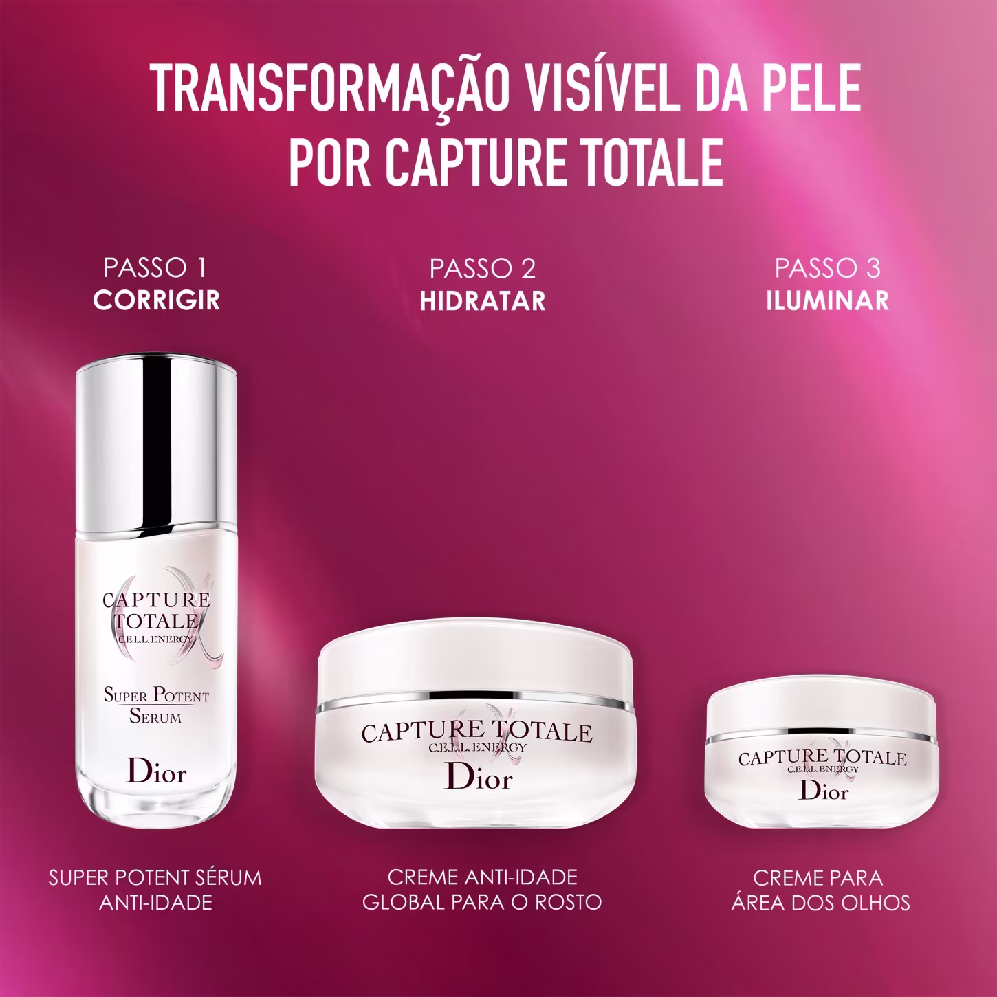 Kit Dior Care Capture Totale traz sérum e creme para o rosto, além de um creme para a área dos olhos, promovendo um cuidado global da face. O uso combinado confere melhora da firmeza da pele, renovação e energia celular e correção das imperfeições.