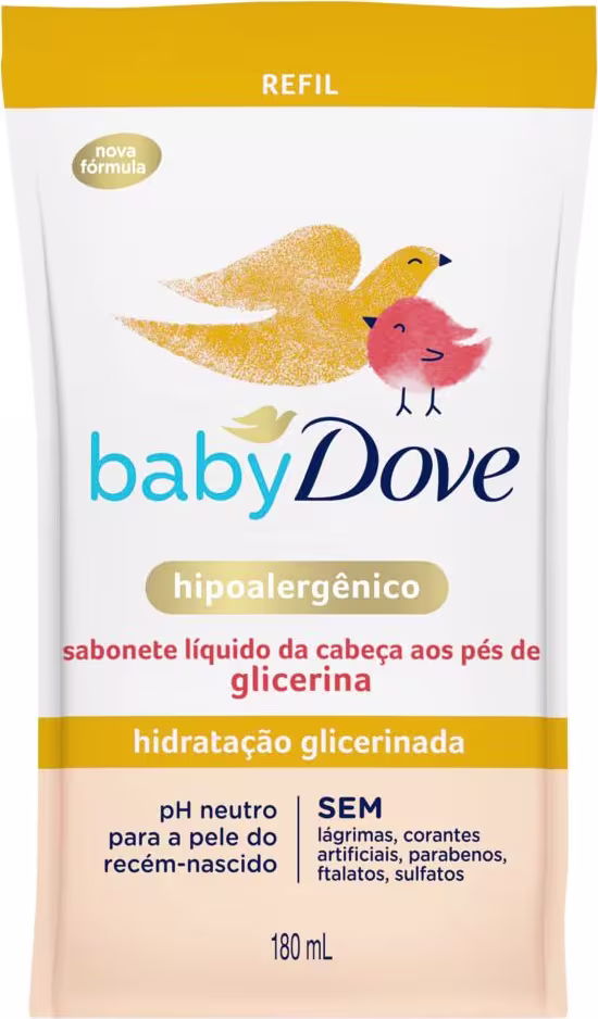 O Kit Dove Baby Dove Hidratação Glicerinada Refil tem uma formulação enriquecida com nutrientes naturalmente presentes na pele, indo além da suavidade e ajudando a repor a hidratação e os nutrientes essenciais que a pele do bebê pode perder durante o banho. Conta com um perfume suave e delicado e pode ser usado no banho, da cabeça aos pés.
