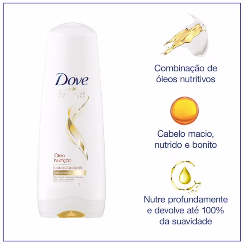 O Condicionador Dove Nutritive Solutions Óleo Nutrição contém óleos de alta performance que nutrem profundamente a fibra capilar, ajudando a reduzir o frizz e deixando os cabelos macios. Apesar de ser uma linha com óleos, Dove Óleo Nutrição não deixa seus cabelos oleosos e com aspecto pesado. Além disso, essa linha traz agora uma nova combinação de óleos, com óleo de girassol, que permitem nutrir tanto os cabelos quanto o couro cabeludo, para um cuidado mais completo.