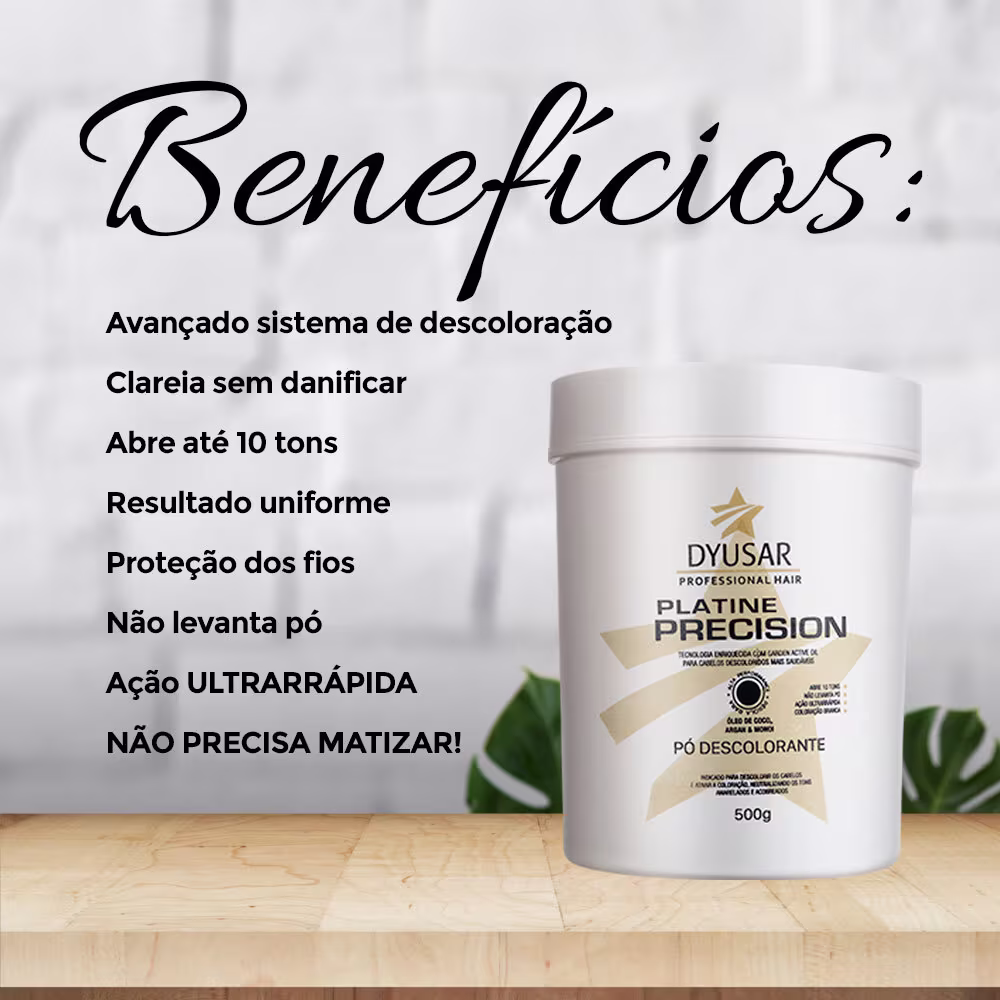 Dyusar Platine Precision - Pó Descolorante 250g: com ação ultrarrápida e sem levantar pó, abre em até 10 tons e proporciona um resultado uniforme aos fios. Além disso, hidrata os cabelos, mantendo a sedosidade e o brilho.