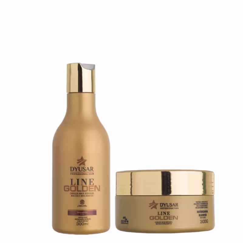 Kit com shampoo e máscara de tratamento para cabelos ressecados. Kit Dyusar Line Golden Duo proporciona um tratamento intenso aos fios.