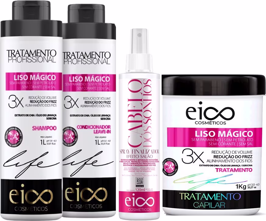Kit com shampoo, condicionador, máscara capilar e spray. Kit Eico Liso Mágico Quarteto para cabelos lisos e quimicamente alisados.