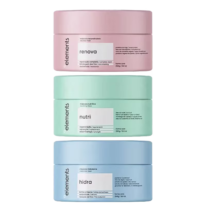Kit Elements Cronograma Capilar: máscaras para reconstrução, nutrição e hidratação. Melhores Kits de Elements na BLZ. Ver mais ❯