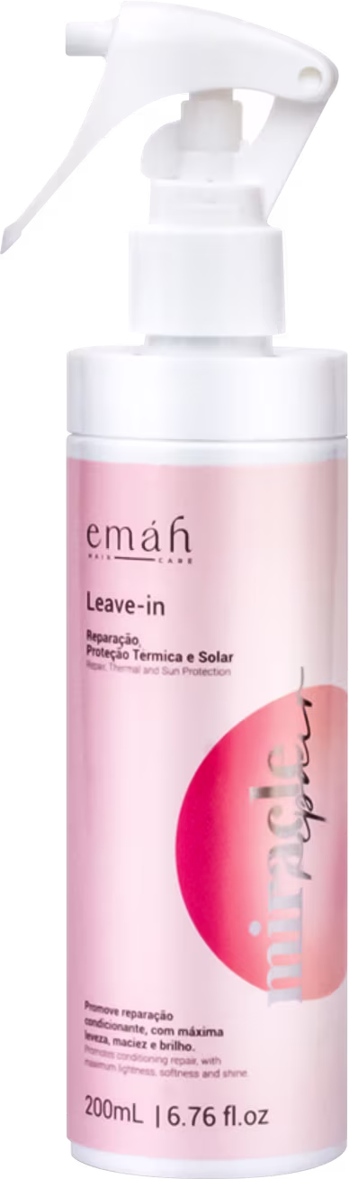 Emáh Hair Care Miracle Repair - Leave-in 200ml: com ação reconstrutora, promove resistência e força aos fios, conferindo aspecto saudável aos cabelos. Possui fórmula única para hidratar, nutrir e proteger as fibras capilares, selando-as e mantendo maciez e brilho nos fios.