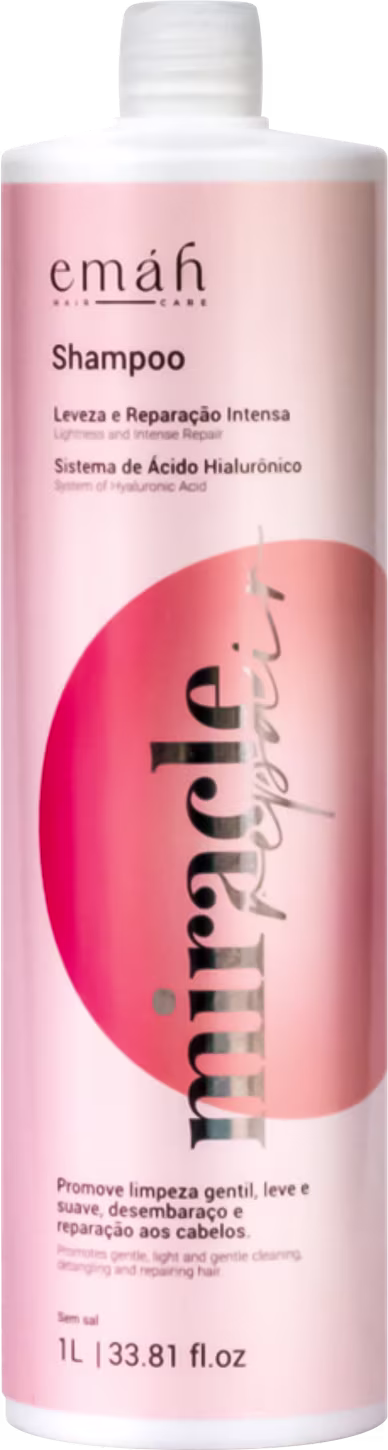 Emáh Hair Care Miracle Repair - Shampoo 1L: revigora os cabelos quimicamente tratados, limpando profundamente os fios de forma equilibrada. Garante selamento das fibras capilares, mantendo a hidratação e reduzindo o frizz. Oferece brilho, força e maciez aos fios.
